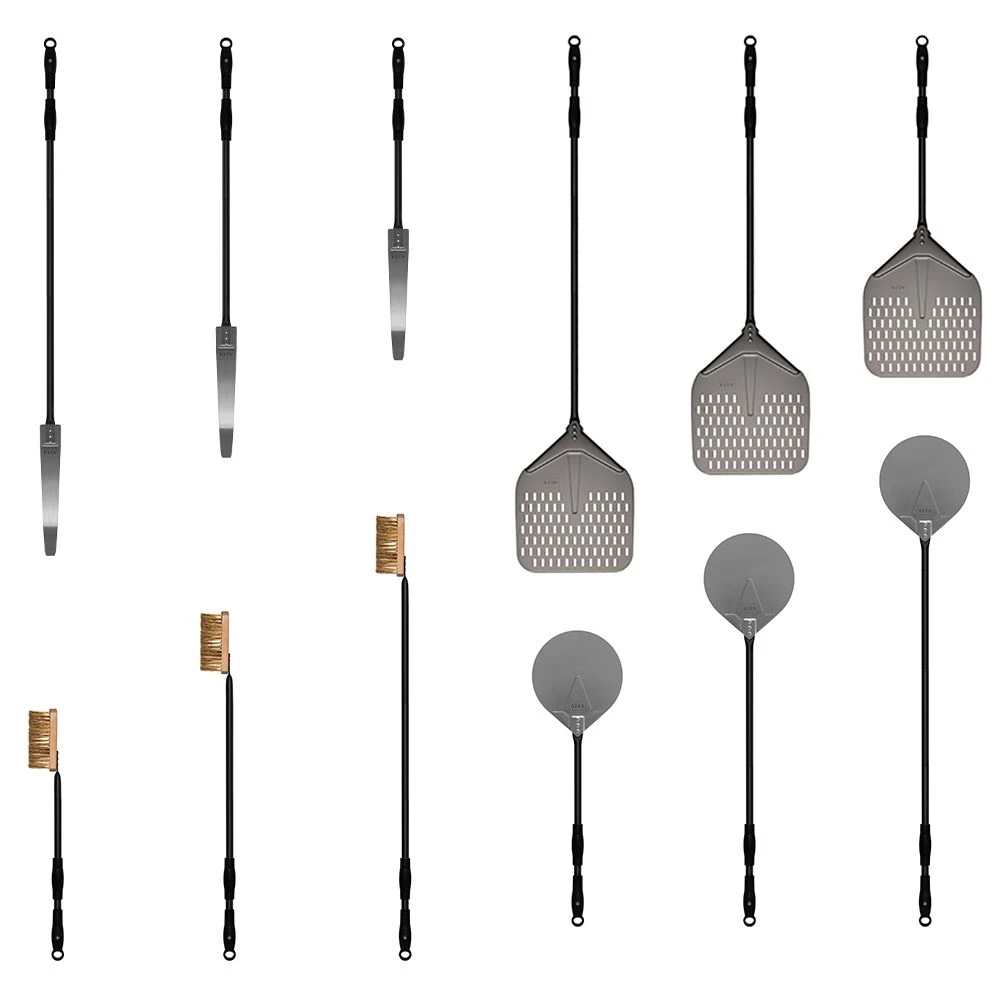 Alfa AC-5PSET36 36-Inch Medium Pizza Peel, Turner, Brush, Rake, and Shovel provides a premium accessory set for use with your Alfa oven. This pizza peel, turner, brush, rake and shovel set features aluminum and stainless steel construction for superior durability, while adjustable length tubular handles make it easier to work near hot ovens. The brush head features brass bristles to effectively clean the oven floor without damaging the oven, while the included rake makes it easy to move burning wood to keep fires burning evenly. The shovel allows for easy removal of spent embers and ash for more efficient cleanup. Professional non-slip handles provide excellent grip, while the functional design of these tools makes baking more convenient every time you use your oven. These tools are available in either red or black finishes.
